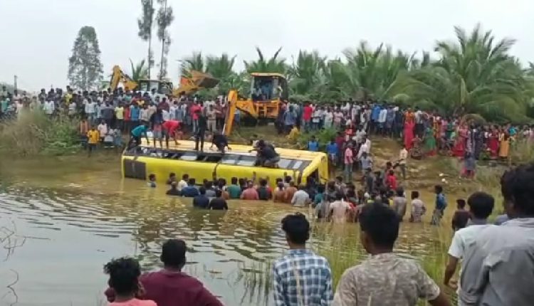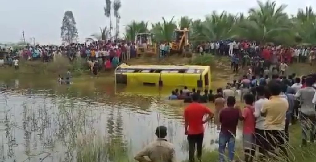 ପୋଖରୀରେ ସ୍କୁଲ ବସ ଓଲଟି ପଡିବାରୁ ଜଣେ ସାତ ବର୍ଷର ବିଦ୍ୟାର୍ଥୀର ମୃତ୍ୟୁ ଘଟିଥିବା ବେଳେ ୧୯ ଜଣ ଆହତ ଅଛନ୍ତି । ସେମାନଙ୍କ ମଧ୍ୟରୁ ୧୧ ଜଣଙ୍କ ସ୍ୱାସ୍ଥ୍ୟବସ୍ଥା ଗୁରୁତର ଅଛି । ଘଟଣା ଘଟିଛି ଆନ୍ଧ୍ରପ୍ରଦେଶର ଶ୍ରୀକାକୁଲମ ଜିଲ୍ଲାରେ । ବୁଧବାର ସକାଳ ୧୦.୩୦ ମିନିଟ ସମୟରେ ଘଟିଛି ଏହି ହୃଦୟ ବିଦାରକ ଘଟଣା। ଶ୍ରୀକାକୁଲମ ଜିଲାର ଏର୍ଚଲା ପଂଚାୟତର ନିମାଵାଣୀ ପେଟା ନିକଟରେ ସ୍କୁଲ ଛାତ୍ରଛାତ୍ରୀଙ୍କୁ ନେଇ ଯାଉଥିବା ସ୍କୁଲ ବସ ଭାରସାମ୍ୟ ହରାଇ ପୋଖରୀ ମଧ୍ୟରେ ଓଲଟି ପଡିଛି।