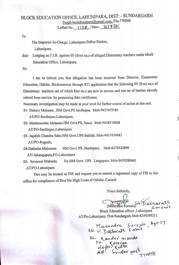 Lahunipada : ଜାଲ ସାର୍ଟିଫିକେଟ ବଳରେ ଶିକ୍ଷକ ଚାକିରୀ କରୁଥିବା ଅଭିଯୋଗ ଆସିବାପରେ ସୁନ୍ଦର ଗଡ଼ ଜିଲ୍ଲାର ବିଭିନ୍ନ ଅଂଚଳରେ ଜାଲ ସାଟିଫିକେଟ ର ଯାଞ୍ଚ ଚାଲିଛି । ଜିଲ୍ଲାପାଳ ଙ୍କ ନିର୍ଦେଶ ରେ ଲହୁଣୀ ପଡା ବ୍ଲକ ଏଜୁକେସନ ଅଫିସ ରେ ଜାଲ ସାର୍ଟିଫିକେଟ ରେ ଚାକିରୀ କରୁଥିବା ଶିକ୍ଷକ ଙ୍କ ଯାଞ୍ଚ ଚାଲିଥିଲା । ଯାଞ୍ଚ ସମୟରେ ପାଞ୍ଚ ଜଣ ଶିକ୍ଷକ ଜାଲ ସାର୍ଟିଫିକେଟ ବଳରେ କାମ କରୁଥିବା ଜଣାପଡିଥିଲା । ଏ ବାବଦରେ ବ୍ଲକ ଏଜୁକେସନ ଅଫିସର ଲହୁଣୀପଡା ଥାନାରେ ଏତେଲା ଦେବା ପରେ ପୋଲିସ ଏକ ମାମଲା ଦାୟର କରି ତଦନ୍ତ କରୁଛନ୍ତି । ଜାଲ ସାର୍ଟିଫିକେଟ ଦେଇ ଚାକିରୀ କରୁଥିବା ପାଞ୍ଚ ଜଣ ଶିକ୍ଷକ ଙ୍କ ମଧ୍ୟରୁ ଚାରିଜଣ ଚାକିରୀ କରୁଥିବା ବେଳେ ଜଣେ ଅବସର ନେଇ ସାରିଛନ୍ତି ।