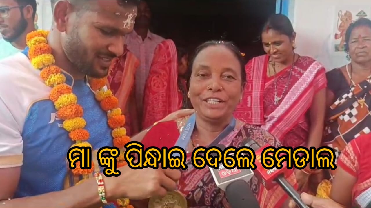ସୁନ୍ଦରଗଡ଼ : ୨୨/୮(ସତ୍ୟାନ୍ୟୁଜ) ସେତେ ବେଳେ ଥିଲା ଅତି ଭାବବିହ୍ବଳ ସମୟ। ଯେତେ ବେଳେ ହକି ତାରକା ଅମିତ୍ ରୋହିଦାସ ନିଜ ମା ଙ୍କୁ ବେକରୁ କାଢି ପିନ୍ଧାଇ ଦେଲେ ଅଲମ୍ପିକ୍ ମେଡାଲ। ଆଜି ନିଜ ଗାଁ ମାଟିରେ ଅଲିମ୍ପିକ ବ୍ରୋଞ୍ଜ ମେଡ଼ାଲିଷ୍ଟ ଅମିତ ରୋହିଦାସ ପହଞ୍ଚିବା ପରେ ତାଙ୍କୁ ବିପୁଳ ସମ୍ବର୍ଦ୍ଧନା ଦିଆ ଯାଇଥିଲା। ଗୁରୁବାର ସକାଳେ ସୁନ୍ଦରଗଡ଼ ଜିଲ୍ଲା ବାଲିଶଙ୍କରା ବ୍ଲକ ସଉନାମୁରା ଗାଁରେ ପହଞ୍ଚି ଥିଲେ ଅମିତ। ଜନ୍ମ ମାଟିରେ ପହଞ୍ଚିବା ପରେ ଗାଁ ମୁଣ୍ଡରୁ ତାଙ୍କୁ ସ୍ଵାଗତ କରି ନେଇଥିଲେ ଗାଁ ଲୋକେ ଏବଂ ପରିବାର ବର୍ଗ । ସଙ୍ଗେ ସଙ୍ଗେ ନାଚ ଗୀତରେ କମ୍ପି ଗଲା ଗାଁ ପରିବେଶ। ଘରେ ଘରେ ଦେଖାଗଲା ଖୁସି ର ମାହୋଲ । ଘରେ ତାଙ୍କୁ ବନ୍ଦାପନା କରି ସ୍ବାଗତ କରିଥିଲେ ତାଙ୍କ ମାଆ । ତାପରେ ଅମିତ୍ ତାଙ୍କ ମା’ ଙ୍କୁ ବେକରୁ କାଢି ପିନ୍ଧାଇ ଦେଲେ