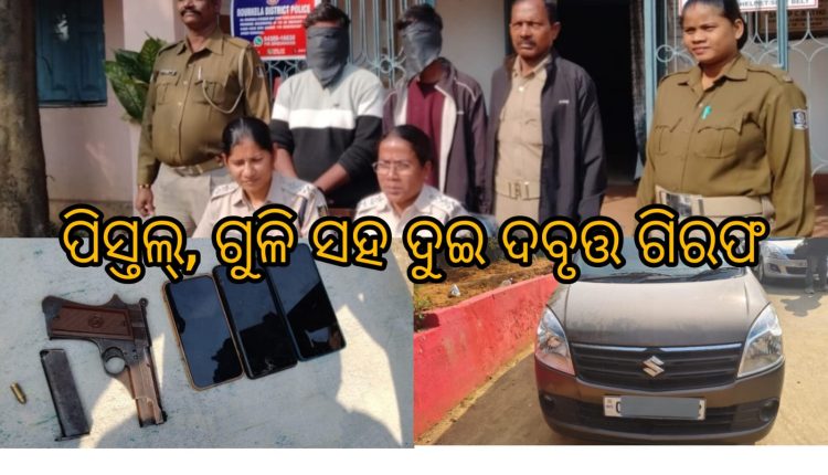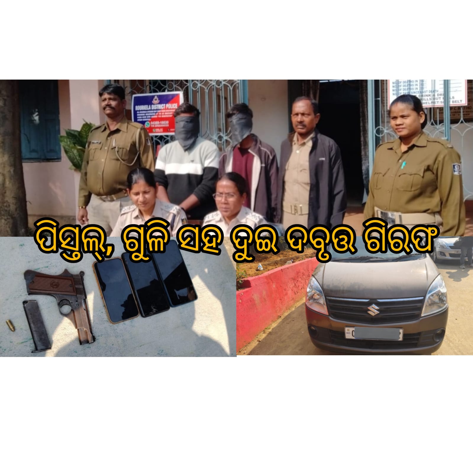 ରାଉରକେଲା : ପିସ୍ତଲ୍, ଗୁଳି ସହ ଦୁଇ ଦୁବୃତ୍ତ ଗିରଫ।। ୱାଗନର୍ କାର ଜବତ।। ବିକ୍ରି କରିବା ଉଦ୍ଦେଶ୍ୟରେ ପିସ୍ତଲ୍ ନେଉଥିବା ବେଳେ ଧରିଲେ ପୋଲିସ।