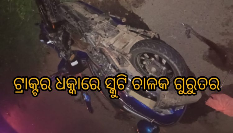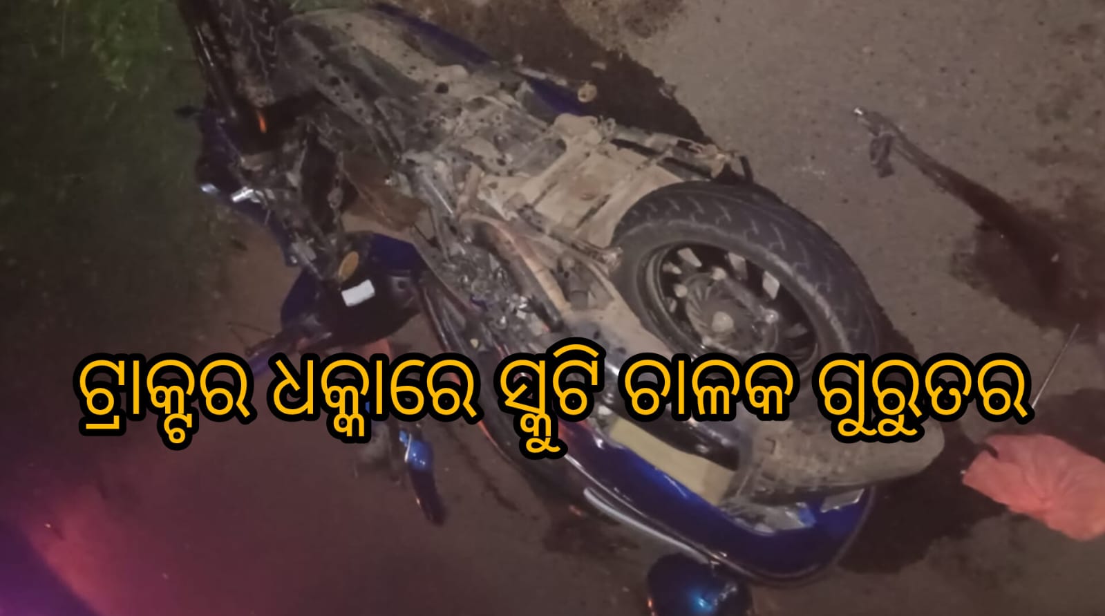 ବଣାଇ: ୬/୮(ସତ୍ୟାନ୍ୟୁଜ) ବଣାଇଁ ଥାନା ଅନ୍ତର୍ଗତ ନରେନ୍ଦ୍ର -ଗୁରୁଣ୍ଡିଆ ପୂର୍ତ୍ତ ବିଭାଗ ରାସ୍ତାର ଜୀବିକା ନିକଟରେ ଟ୍ରାକଟର ଧକ୍କା ରେ ସ୍କୁଟି ଚାଳକ ଆହତ ହୋଇଛନ୍ତି I ଟ୍ରାକଟର ରେ ଲାଇଟ ନଥିବା ଯୋଗୁଁ ଅନ୍ଧାରରେ ଧକ୍କା ଦେଇଥିବା ଅଭିଯୋଗ ହୋଇଛି I ଟ୍ରାକଟର ରେ ଲାଗିଥିବା କାଜୁଆଲ ରେ ସ୍କୁଟି ଚାଳକ ଙ୍କ ଗୋଡ ଛିଣ୍ଡି ଯାଇଥିବା ଜଣାପଡିଛି I
