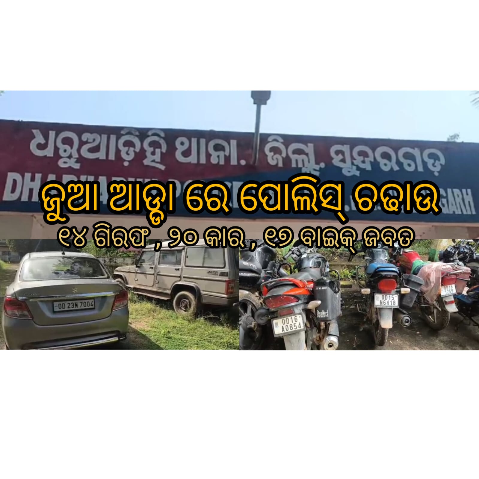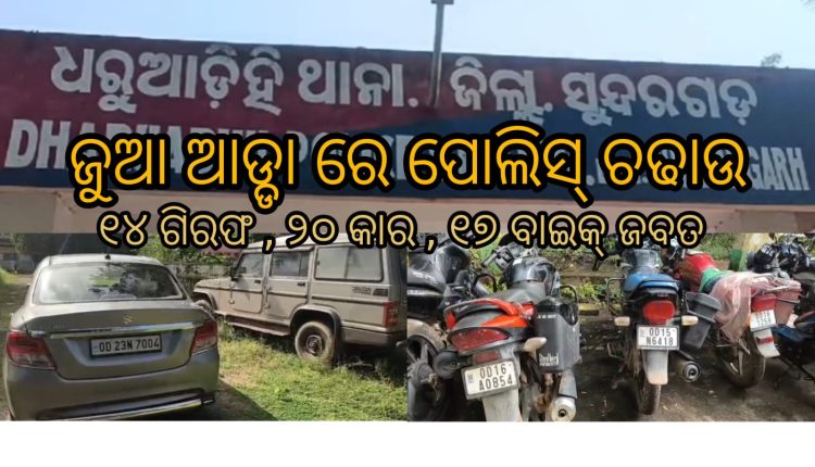 ସୁନ୍ଦରଗଡ଼ : ବଡ଼ ଧରଣର ଜୁଆ ଆଡ୍ଡା ଉପରେ ପୋଲିସ୍ ର ଚଢାଉ।। ୧୪ ଗିରଫ।। ୨୦ କାର , ୧୭ ବାଇକ୍ ସହ ୧ ଲକ୍ଷରୁ ଉର୍ଦ୍ଧ୍ବ ଟଙ୍କା ଜବତ।
