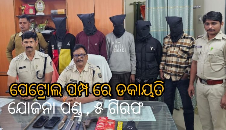 ରାଜଗାଙ୍ଗପୁର: ପୋଲିସ୍ ର ତତ୍ପରତା ଯୋଗୁଁ ପେଟ୍ରୋଲ ପମ୍ପ ରେ ଡକାୟତି ଯୋଜନା ପଣ୍ଡ।। ୫ ଗିରଫ।। ପିସ୍ତଲ୍ ସହ ବିଭିନ୍ନ ମାରଣାସ୍ତ୍ର ଜବତ୍।
