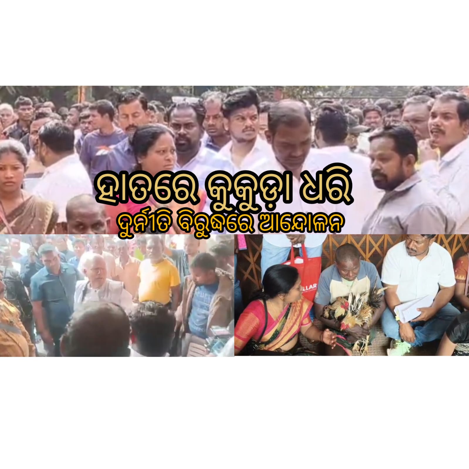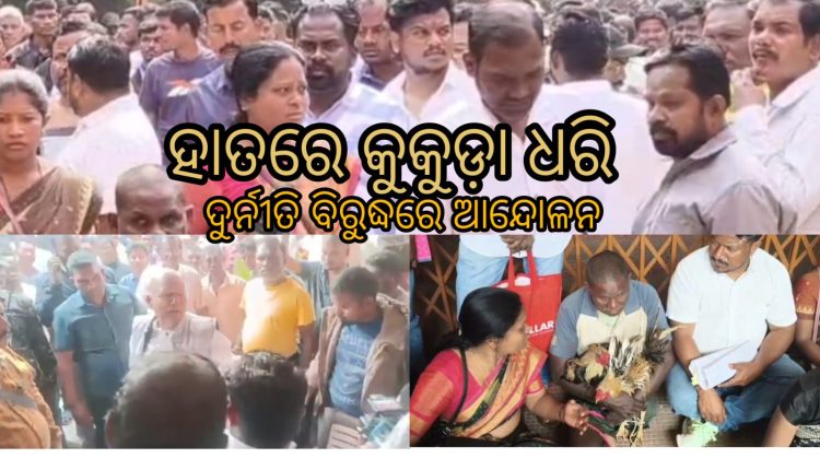 ରାଉରକେଲା : ଦୁର୍ନୀତି ବିରୁଦ୍ଧରେ ଅଭିନବ ପ୍ରତିବାଦ।। ହାତରେ କୁକୁଡ଼ା ଧରି ଆନ୍ଦୋଳନ।। ତହସିଲ ଗେଟ୍ ରେ ପକାଇଲେ ତାଲା।