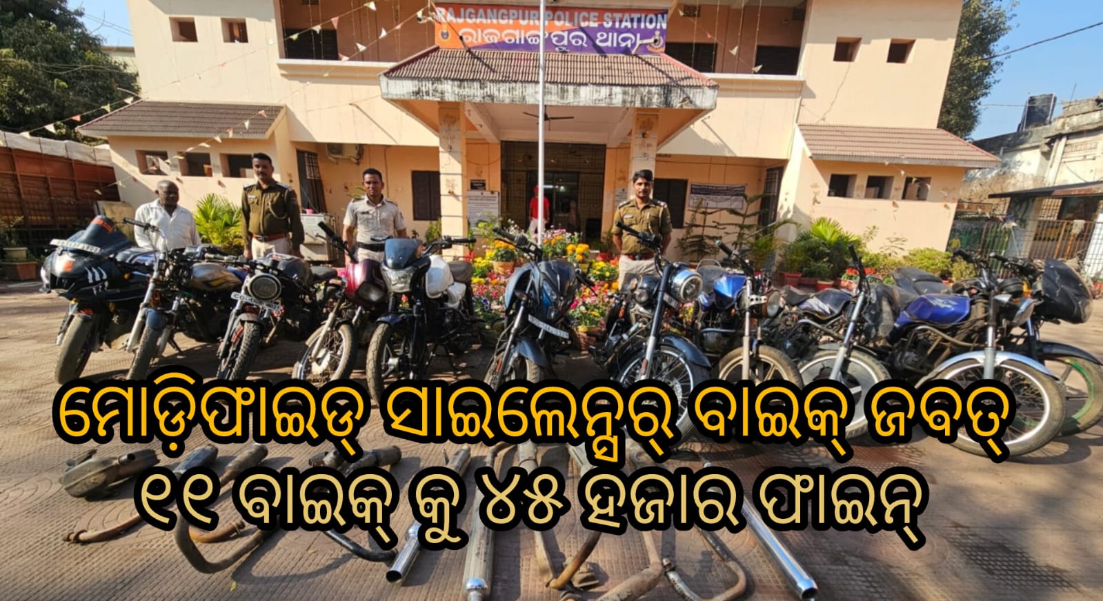 ରାଜଗାଙ୍ଗପୁର : ମୋଡ଼ିଫାଇଡ୍ ସାଇଲେନ୍ସର୍ ଲଗାଇ ଶବ୍ଦ ପ୍ରଦୂଷଣ କରୁଥିବା ୧୧ ବାଇକ୍ ଜବତ୍।। ୪୫ ହଜାର ଟଙ୍କା ଜରିମାନା।