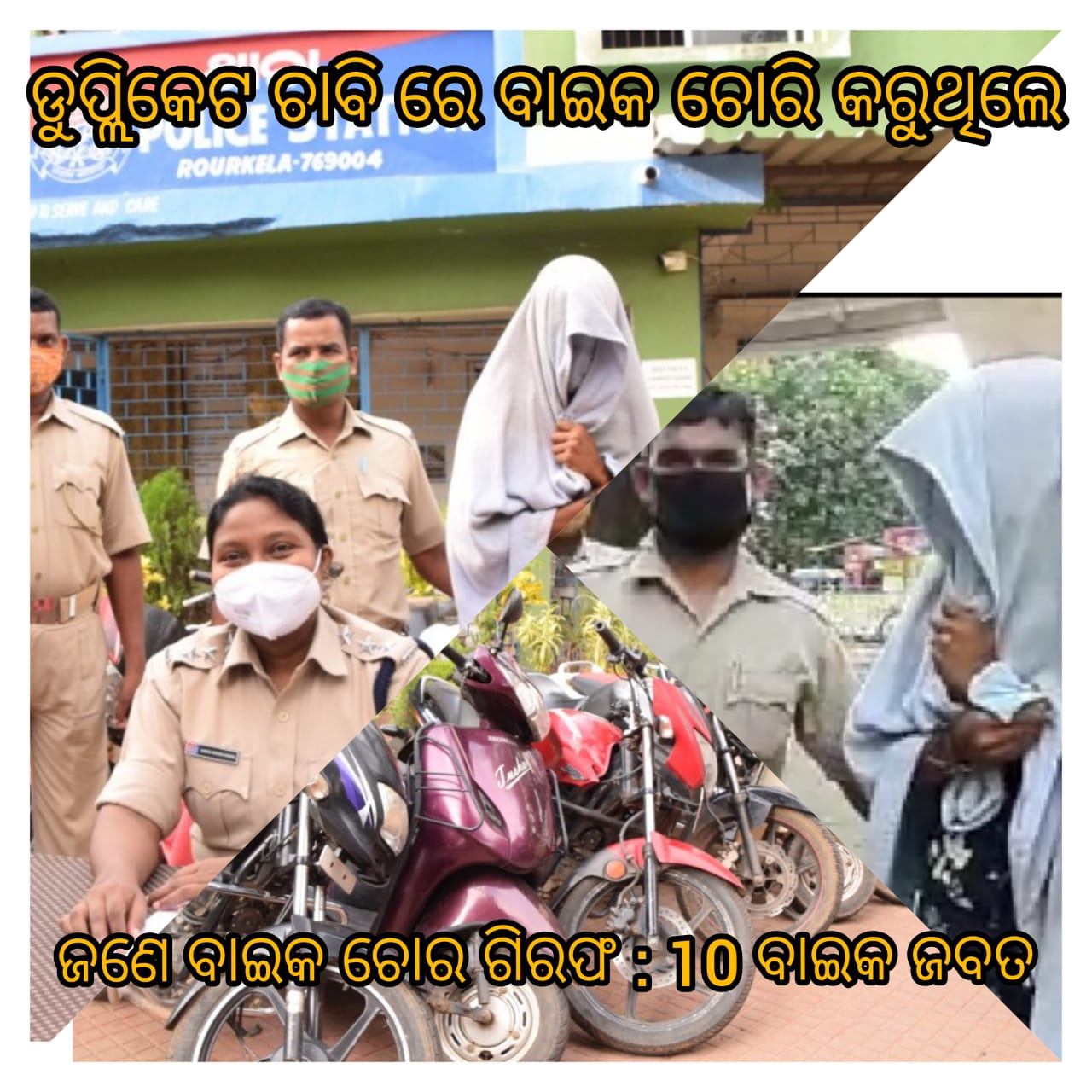 ରାଉରକେଲା ର ବିଭିନ୍ନ ଥାନା ଅଞ୍ଚଳ ରେ କିଛିଦିନ ହେଲା ବାଇକ ଚୋରି ଘଟଣା ଅଚାନକ ବୃଦ୍ଧି ପାଇଛି । ଗତ ଦୁଇଦିନ ମଧ୍ୟରେ ରଘୁନାଥପାଲି ଥାନା ଅଞ୍ଚଳ ରେ ତିନିଟି ବାଇକ ଚୋରି ହୋଇଯାଇଥିଲା । ପୋଲିସ ଏହି ଚୋରି ଘଟଣାକୁ ଗୁରୁତର ସହ ନେଇ ବାଇକ ଚୋରି ରାକେଟ ର ପର୍ଦାଫସ କରିବାକୁ ଲାଗି ପଡ଼ିଥିଲେ । ଆଜି ପୋଲିସ ଧିରଜ ଝା ନାମକ ଜଣେ ଯୁବକ କୁ ସନ୍ଦେହରେ ଏକ ପଲସର ବାଇକ ସହ ଧରିଥିଲେ । ପରେ ଜେରା ପରେ ତାଙ୍କ ଗ୍ୟାଙ୍ଗ ରାଉରକେଲା ସମେତ ଜିଲ୍ଲାର ବିଭିନ୍ନ ସ୍ଥାନରେ ବାଇକ ଚୋରିକରିଥିବା ଜଣାପଡିଥିଲା । ପୋଲିସ ଧିରଜ ର ସୂଚନା ଆଧାର ରେ ଦଶ ଟି ଚୋରା ବାଇକ ବିଭିନ୍ନ ସ୍ଥାନରୁ ଜବତ କରିଥିଲେ । ଗୁରୁବାର ଦିନ ଗିରଫ ଧିରଜ ଝା କୁ କୋର୍ଟ ଚାଲାଣ କରାଯାଇଛି ।